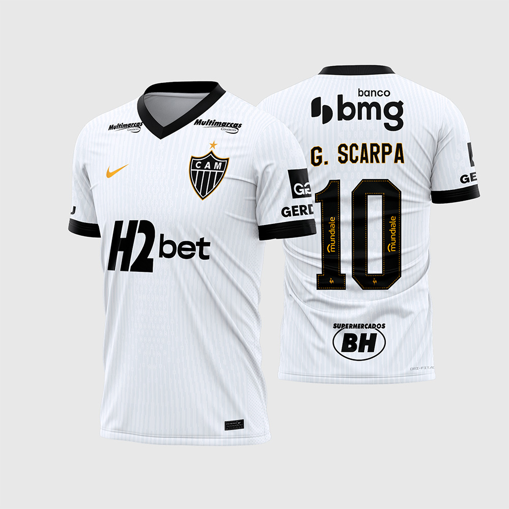 Por outro lado, o que realmente transforma esta arte em uma verdadeira máquina de faturamento é o seu impressionante nível de detalhamento clássico. Na parte frontal, temos a aplicação impecável de um padrão de linhas verticais muito finas (pinstripes) em tom cinza claro sobre o fundo branco, servindo de base perfeita para o escudo do Galo, a logomarca esportiva em amarelo e os patrocinadores oficiais (como a H2bet) saltarem aos olhos com um contraste espetacular. Consequentemente, a camisa final impressa entregará uma estética super sofisticada, clean e de extremo bom gosto.