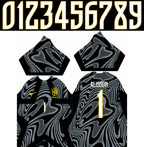 Da mesma forma, as costas da peça mantêm o absoluto requinte estético. O layout acompanha a numeração oficial da temporada estilizada em branco com bordas amarelas, ilustrada perfeitamente no mockup com o nome do ídolo “ALISSON” e a camisa 1. Para completar, o grafismo ondulado continua de forma contínua pelas costas e mangas, criando um visual coeso e hipnotizante. Portanto, o layout final é perfeito para quem quer fechar o gol com muita classe na próxima Copa.