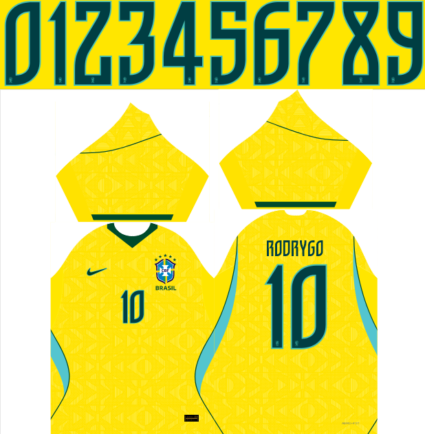 Por outro lado, o que realmente transforma essa arte em uma obra-prima é a sua riqueza de detalhes gráficos perfeitamente vetorizados. Na parte frontal, temos a aplicação impecável do escudo da CBF centralizado, acompanhado do logotipo da fornecedora esportiva. Um destaque absoluto é a textura de fundo com padrões geométricos e tribais super sutis, reproduzida com perfeição para enriquecer a malha. Consequentemente, a camisa final impressa entregará uma estética premium, digna das prateleiras das maiores lojas de artigos esportivos.