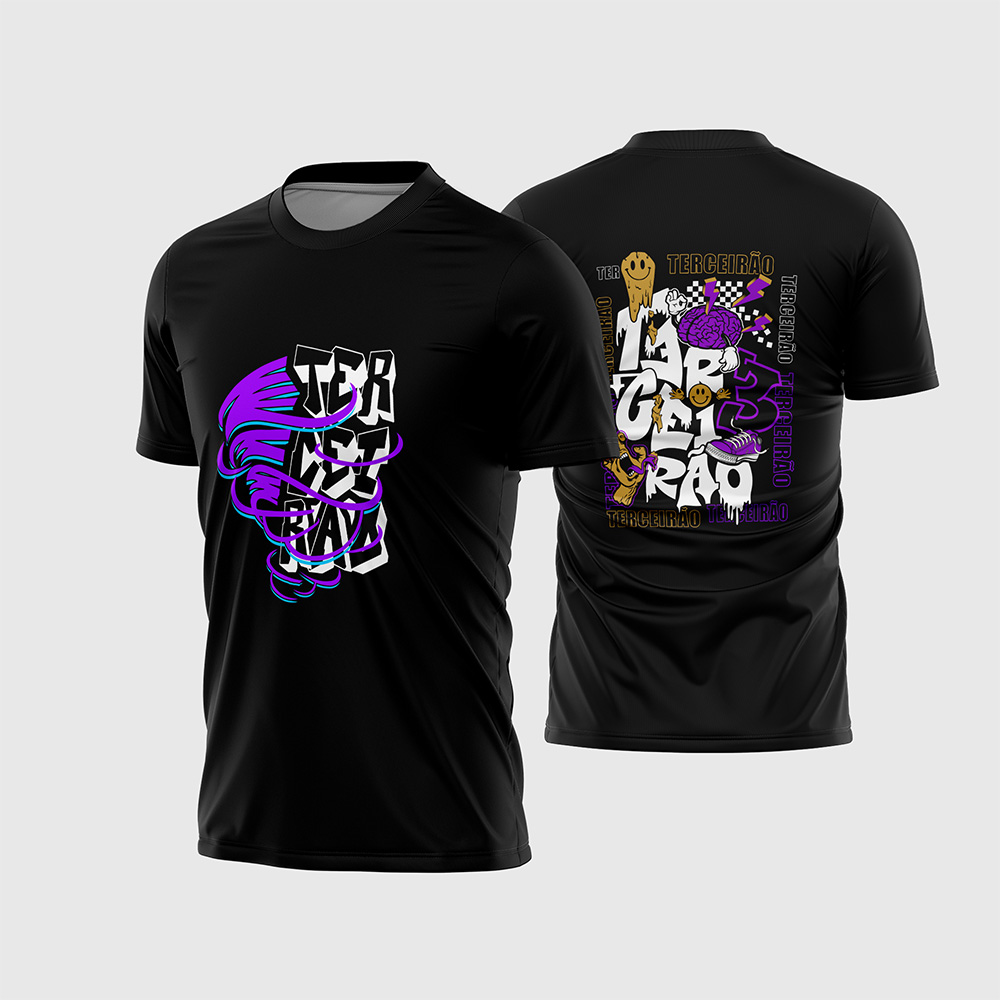 Por outro lado, o que realmente transforma esta arte em uma verdadeira máquina de faturamento é o seu impressionante trabalho de ilustração voltado para o público jovem. Na parte frontal, temos a aplicação genial da palavra “TERCEIRÃO” em blocos 3D assimétricos, sendo envolvida por um dinâmico furacão/tornado roxo com traços de neon. Consequentemente, a camisa final impressa entregará uma estética super moderna, que transmite movimento e a força da turma.