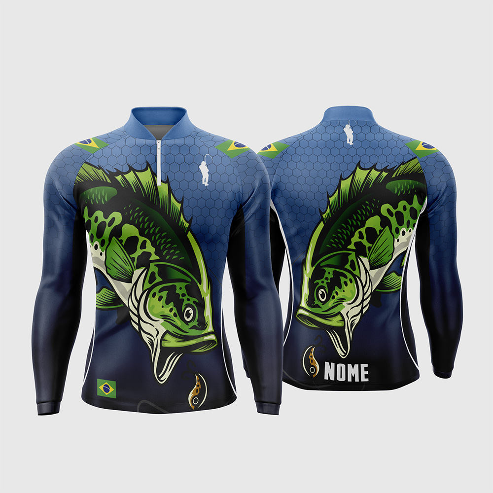 Da mesma forma, as costas e os detalhes complementares mantêm o absoluto requinte visual e a ferocidade do tema. O layout traz a continuidade da ilustração gigante do peixe e da isca nas costas, oferecendo um espaço estrategicamente posicionado na barra inferior para o “NOME” do cliente. Para completar, as mangas longas acompanham o degradê para o azul escuro, e o design conta com a Bandeira do Brasil nos ombros e na barra frontal, além da clássica silhueta do pescador e da gola padre com zíper frontal, fechando a composição com total maestria esportiva. Portanto, o layout final é o sonho de consumo perfeito para vestir qualquer equipe com muita atitude.