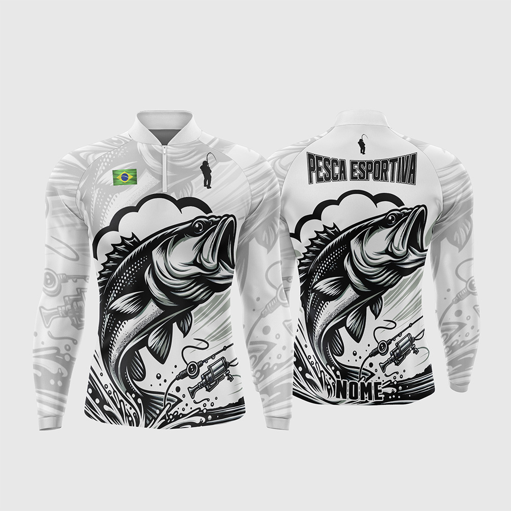Da mesma forma, as costas e os detalhes complementares mantêm o absoluto requinte visual e a paixão pelo esporte. O layout traz a continuidade da ilustração espetacular nas costas, repousando sobre sutis e belíssimas texturas em tons de cinza claro, e oferecendo um espaço estrategicamente posicionado na barra inferior para o “NOME” do cliente. Para completar, as mangas longas brancas ajudam a manter o frescor térmico e acompanham as texturas suaves, aliadas à Bandeira do Brasil colorida no peito (dando o único toque de cor da peça), à silhueta do pescador e à clássica gola padre com zíper frontal, fechando a composição com total maestria esportiva. Portanto, o layout final é o sonho de consumo perfeito para vestir qualquer equipe com muita classe.