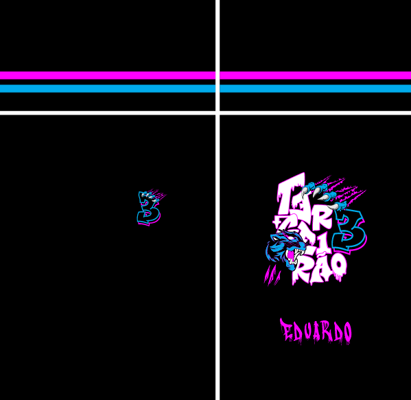 Por outro lado, o que realmente transforma esta arte em uma verdadeira máquina de faturamento é o seu impressionante trabalho de ilustração nas costas. O layout traz uma espetacular cabeça de pantera negra rugindo com contornos impactantes em azul, interagindo diretamente com a tipografia estilizada da palavra “TERCEIRÃO”, o número 3 e as marcas de garras rasgando o tecido em rosa neon. Consequentemente, a camisa final impressa entregará uma estética super imponente, selvagem e ao mesmo tempo incrivelmente “hype”, lembrando a aclamada estética Cyberpunk e Neon Vibes.