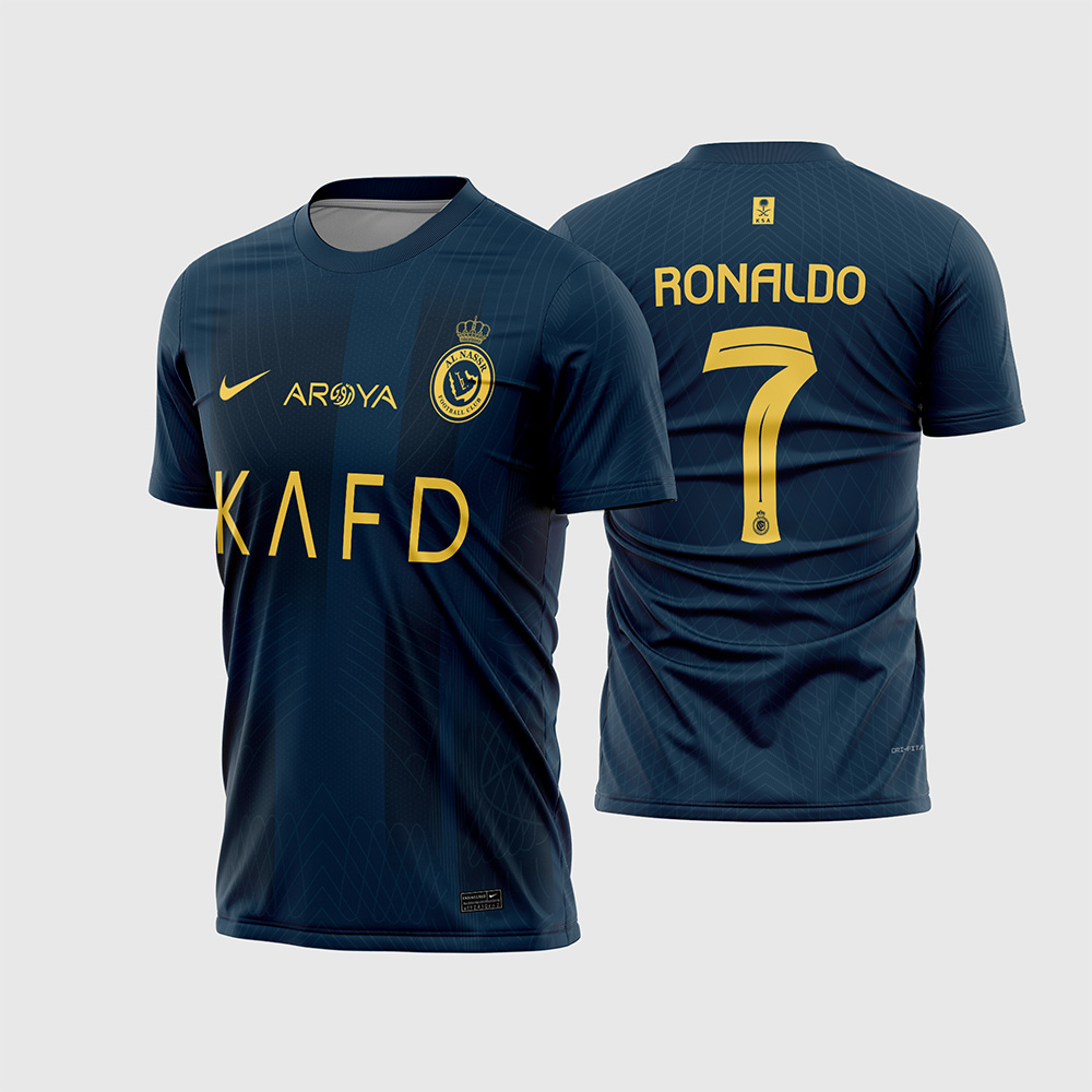 Leve sofisticação para sua estamparia com a Arte Vetor Camisa Al-Nassr Reserva 2023 – 2024. Enquanto a camisa amarela é vibrante, o uniforme reserva (Away Kit) aposta na elegância do Azul Marinho (Navy) com detalhes dourados. É a escolha perfeita para torcedores que buscam uma peça mais discreta e estilosa para usar no dia a dia, sem abrir mão de estampar o time de Cristiano Ronaldo.