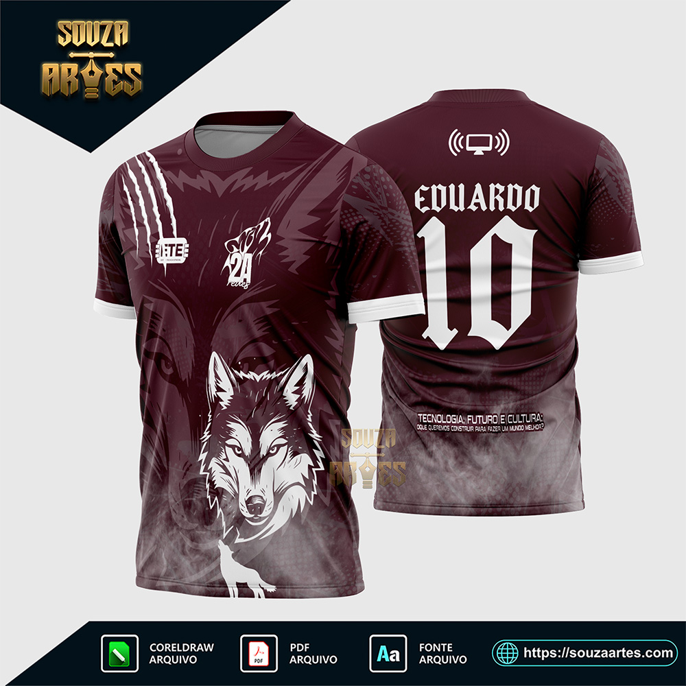 A qualidade superior do vetor garante reproduções fiéis. Em outras palavras, você obtém um design preciso, com o contraste elegante da cor vinho e a força do mascote lobo para o uniforme da sua classe. Além disso, esta arte é perfeita para sublimação. Ela transforma qualquer peça em um ícone de união e força, permitindo que você leve a emoção dos jogos para qualquer lugar.