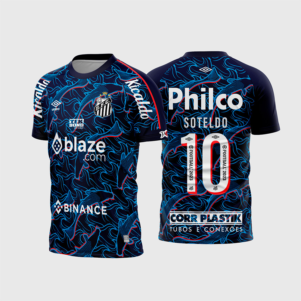 Por outro lado, o que realmente transforma esta arte em uma joia rara para a sua plataforma é a complexidade do seu padrão gráfico perfeitamente vetorizado. Na parte frontal, temos a aplicação impecável do escudo do Santos com a coroa do Rei Pelé, perfeitamente harmonizada sobre as texturas orientais, além de trazer todos os patrocínios oficiais da temporada (como Blaze, Binance e TekBond). Consequentemente, a camisa final impressa entregará uma estética premium, digna das edições limitadas e de colecionador.