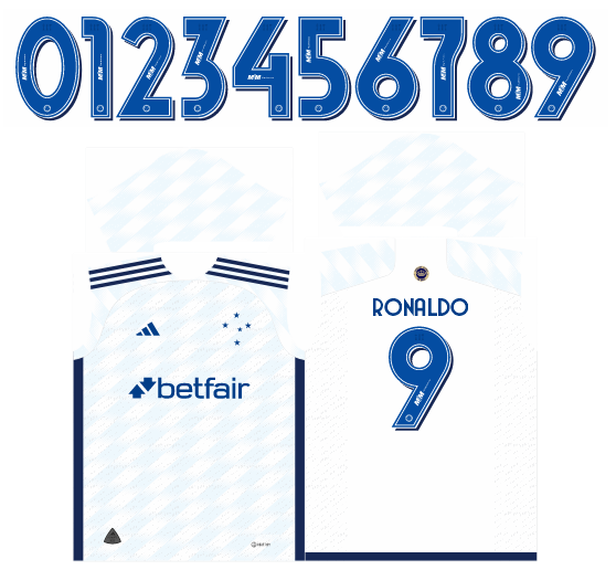 Da mesma forma, as costas da peça mantêm o absoluto requinte e o impacto visual inconfundível. O layout já acompanha a numeração oficial estilizada da temporada, ilustrada perfeitamente no mockup com o nome do ídolo e gestor “RONALDO” e a lendária camisa 9. Para completar, o selo comemorativo na altura da nuca e as clássicas três listras nos ombros fecham o design com total maestria esportiva. Portanto, o layout final é o sonho de consumo perfeito para qualquer cruzeirense de coração.