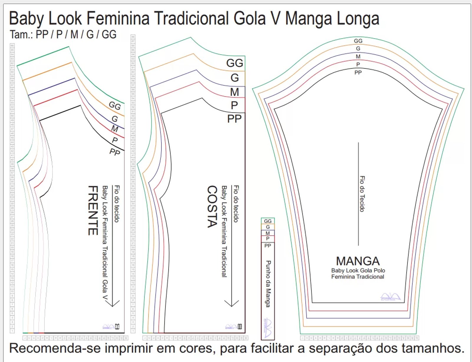 Molde de Costura Para Imprimir Camiseta – 08 – Baby Look Tradicional Gola V Manga Longa (PP ao GG)