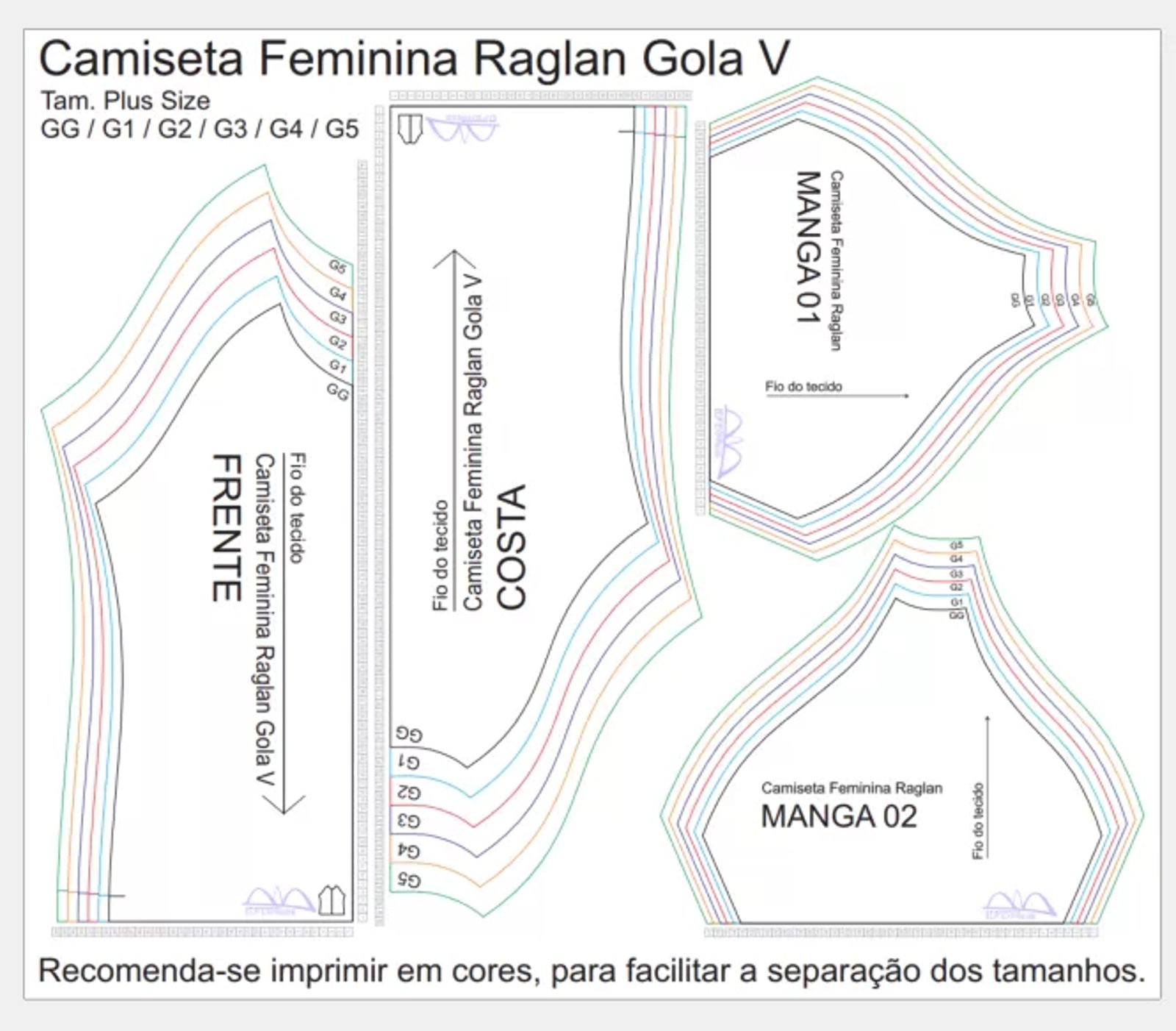 Molde de Costura Para Imprimir Camiseta – 11 – Baby Look Raglan Feminina Gola V Manga Curta (GG ao G5)