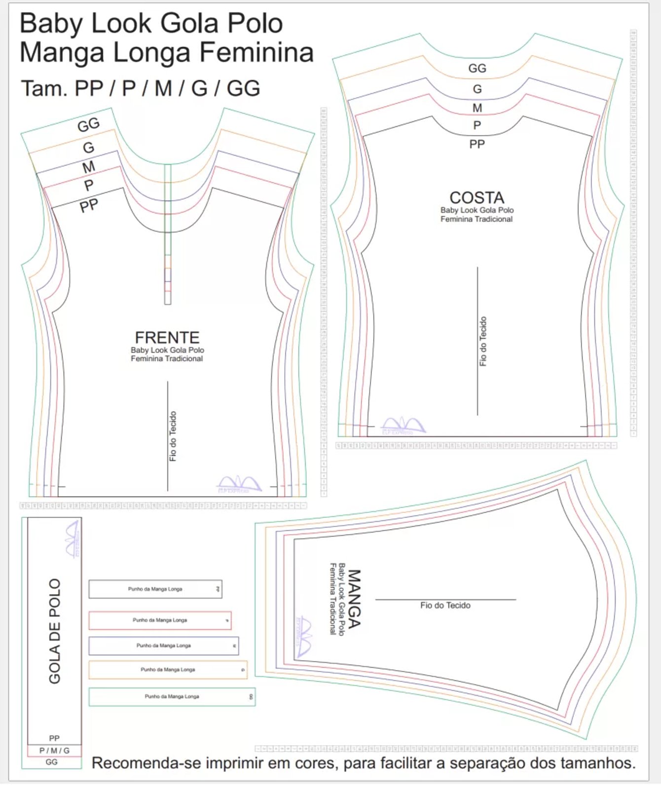 Molde de Costura Para Imprimir Camiseta – 20 – Baby look Gola Polo Tradicional Manga Longa (PP ao GG)