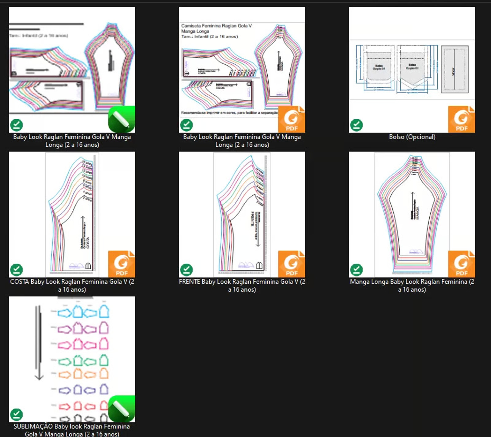 A qualidade do arquivo digital garante medidas exatas. Em outras palavras, você obtém um molde testado, com grade de tamanhos variada, pronto para imprimir em impressora comum (A4) ou plotter. Além disso, este molde é essencial para quem trabalha com sublimação total, servindo como gabarito para aplicar as artes antes do corte.